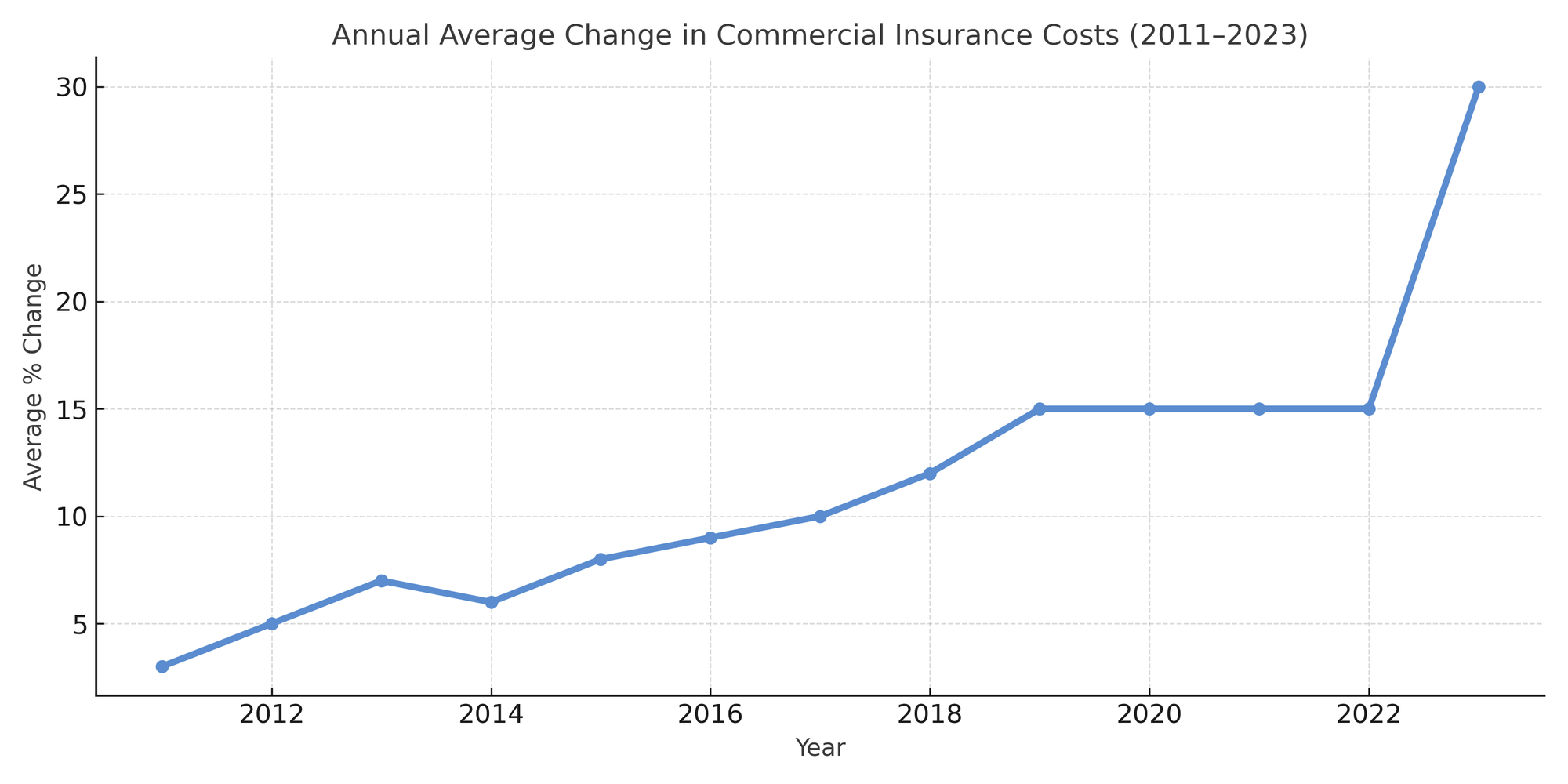 Insurance costs for commercial properties climbed steadily since 2011, surging nearly 30% by 2023.